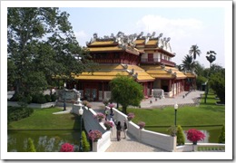 Jour 2 Bang Pa In, palais d’été du roi A 15 km d’Ayutthaya Bang Pa in est situé à 60 km au nord de Bangkok. volonté de Rama IX les styles architecturaux du palais sont multiples : Chinois (photo ci-contre), birmans, thaï et même européens. Nous apprenons par Marisa (notre guide) que le roi est adoré en Thaïlande (elle précise qu’elle l’a personnellement vu 3 fois, qu’il est très beau, il aurait la peau douce et rose) Flo me montre sa peau douce et rose comme celle du roi. 😉 |