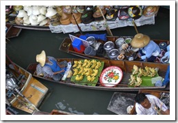 | Jour 9 Bangkok Marché flottant et Palais Tôt le matin direction Damnoen Saduak et son marché flottant. L’endroit est assez fidèle à l’image que nous pouvions nous en faire. Mais nous avons été quand même ébahis par la variété de plats et aliments proposés. La vaisselle étant directement nettoyée dans le Khlong (canal), on se dit aussi que le système immunitaire des habitants doit être vraiment blindé! L’après midi visite du magnifique palais de Bangkok, brillant de mille feux mais sous un soleil de plomb. Christian demande: « Ça y est, c’est terminé maintenant les temples hein ?! » |
