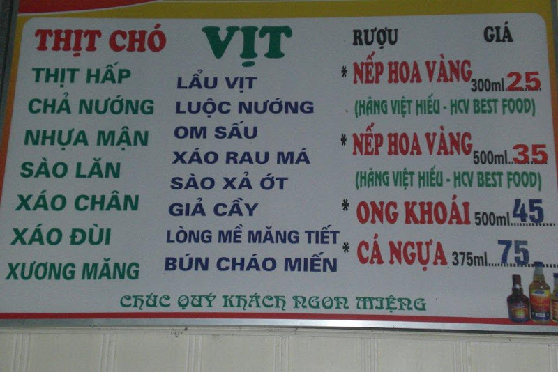dans une gargote pour y déguster une belle brochette de “Tît Cho” …et contre toute attente, la viande est tendre, légèrement prononcée entre la chèvre et le porc mais pas mauvaise du tout ! Alors gare à vos toutous à notre retour :—) Avec nos 30 millions d’amis on est pas prêt de crever de faim…