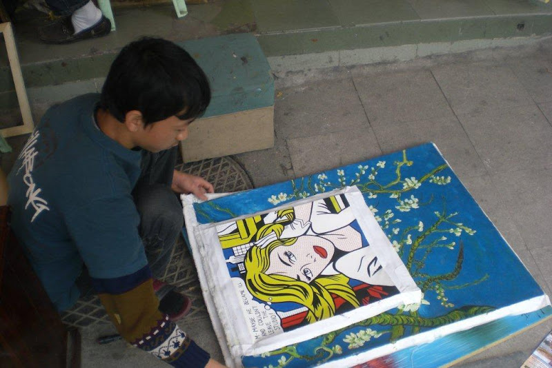 Jour 17, Hanoï, visite de la ville. Nous décollons de Hué dans la soirée en rentrant de la cité impériale. Nous avons réservé une chambre pour 2 nuits au Hanoï Holiday Hotel par Internet juste avant le départ. Le jeune réceptionniste est sympa mais la chambre pas terrible :—( On profite quand même du laundry service pour laver 3kg de linge (4 euros avec repassage) Notre visite d’Hanoï débute par le quartier des 36 corporations, tout proche de notre hôtel. Le nom des rues correspond à une profession. Par exemple : nous logeons à Hàng Manh (stores en bambou) secteur beaucoup plus calme que Hàng Bac (les graveurs sur marbre !) Flo vérifie sur la carte s’il n’existe pas un Hàng Nutella ! ;—) Dans le quartier routard nous réservons chez Ocean Tours nos excursions à venir et dans la même rue, nous investissons sur un Van Gogh et un Lichtenstein (des copies bien sûr, nous ne sommes millionnaires qu’en dongs Viêt !)