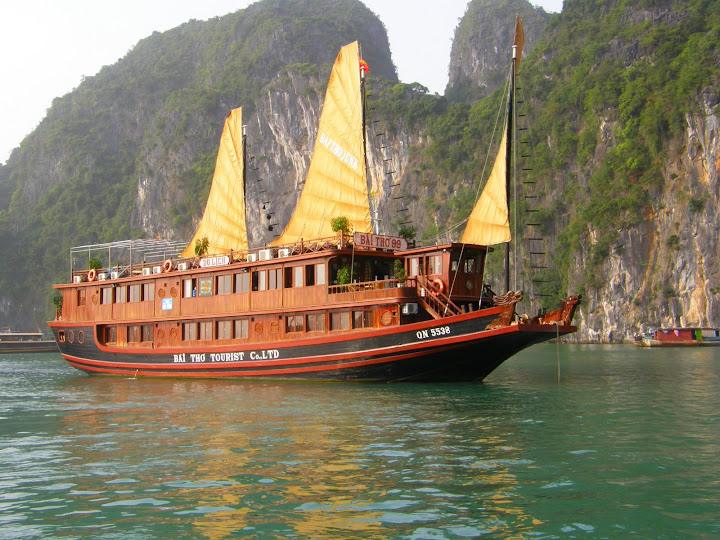 Jour 19, Baie d’Ha Long, croisière jonque Baï tho Pour le point d’orgue de notre voyage, la mythique baie d’Ha Long, c’est à bord d’une jonque traditionnelle que nous embarquons pour un croisière de 2 jours / 1 nuit. Après un rafraichissement en cabine, un repas soigné et très copieux est servi. Dans l’après midi nous pagayons une petite heure au milieu des rochers karstiques de la baie. La légende dit qu’un dragon se débâtant dans l’eau aurait créé ses formes en taillant les montagnes avec sa queue.