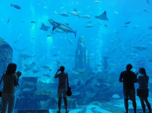 Une bonne première nuit, l’hôtel est calme. Nous allons sur le balcon et surprise, de la brume ! Il s’agit d’un brouillard matinal qui ne se forme qu’entre septembre et mars. C’est une vue atypique mais des saisissantes peuvent être obtenues au sommet des grattes ciel de la ville Nous prenons notre petit déjeuner au restaurant kaleidoscope, superbe vue sur la piscine de l’hôtel et bien sûr, des kilomètres de buffet. Aujourd’hui arrivée à l’hôtel de mon cousin Cédric avec Sabrina. Hasard complet nous avons réservé l’Atlantis dans la même période sur voyage privée. Ils arrivent avec un vol Emirates, nous partagerons avec eux un repas à l’hôtel et la visite de Burj Khalifa. Nous poursuivons la découverte du site en passant l’après midi à l’aquaventure le parc aquatique qui jouxte l’hôtel. En plus des différents toboggans qui me permettent d’entendre crier ma femme, les voies de navigation du parc (les fesses dans une bouées) sont suffisamment longue pour y passer du temps paisiblement alanguis au soleil. Le point d’orgue de ce parc étant l’attraction « the leap of faith » un saut de 30m d’un toboggan quasiment à la verticale terminant au milieu des requins. Le départ est très impressionnant car c’est un saut dans le vide même si on reste au contact du toboggan. La vue est splendide du haut de cette attraction qui a la forme d’une pyramide maya.